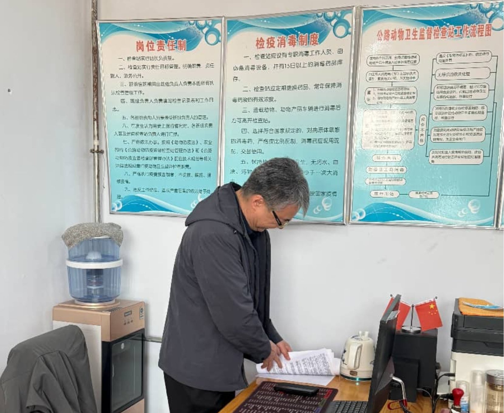 调研组抵达内蒙古自治区指定通道四家子公路动物卫生监督检查站,现场查看畜禽跨县境调运记录、调运车辆检疫证明持证情况及是否有临床检查异常情况等记录,详细核查口蹄疫易感动物经指定通道由外省调入我区的来源、数量、流向及检疫监管落实情况。调研组指出,当前SAT1型口蹄疫已在中东多国广泛传播,SAT1/III 拓扑型致病性极强、传播速度快,我国新疆、甘肃已检出相关病毒核酸,疫情输入风险持续攀升,公路检查站作为外防输入的前沿关口,必须严格落实24小时值班值守制度,逐车查验、闭环管控,坚决守住疫情输入第一道防线。