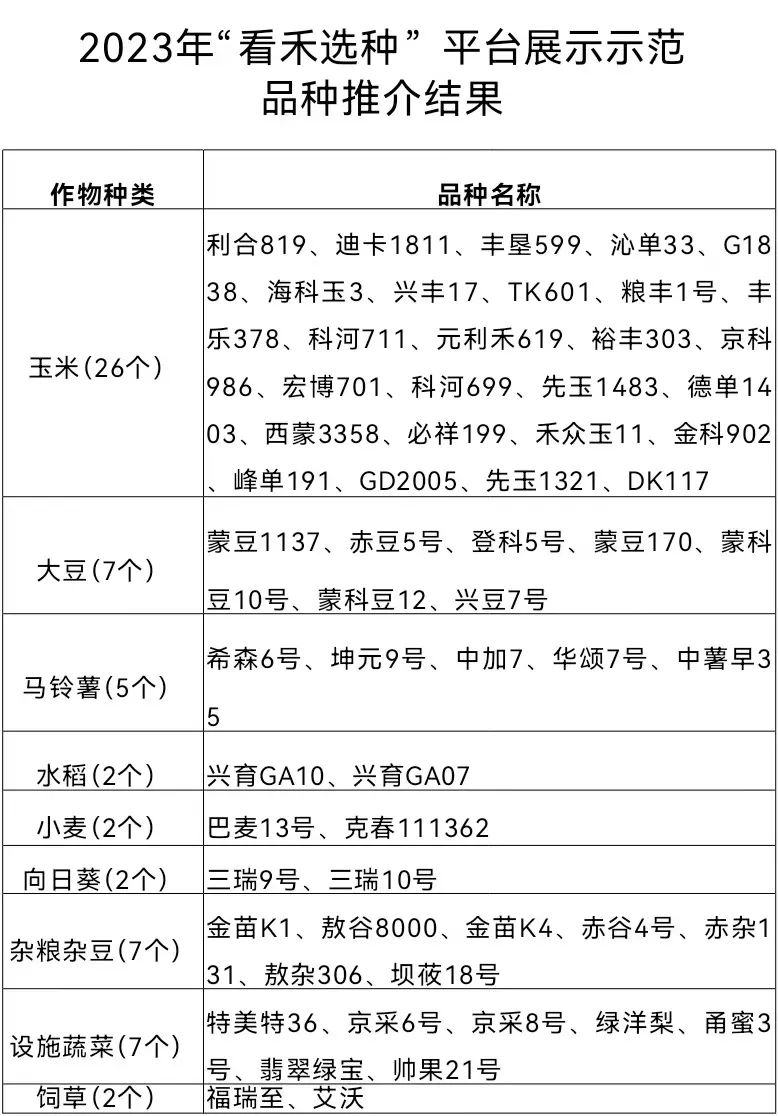 为深入贯彻落实自治区种业振兴行动,加快优良品种推广应用,2023年自治区农牧厅继续在全区12个盟市建设60个“看禾选种”平台,重点打造了玉米、大豆、马铃薯、向日葵、杂粮杂豆5个自治区级区域性平台。各平台聚焦了我区主要粮食作物和优势特色经济作物,通过品种展示示范、跟踪评价、实收测产、专家论证等程序,重点推介了9类农作物、60个适宜内蒙古不同生态区域种植的主导品种。这些品种品质优、抗性好,产量高,在生产上的综合表现优良,为加快推动我区品种的更新换代注入了新动力。