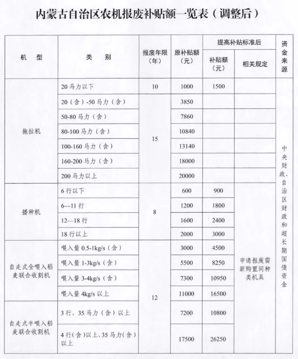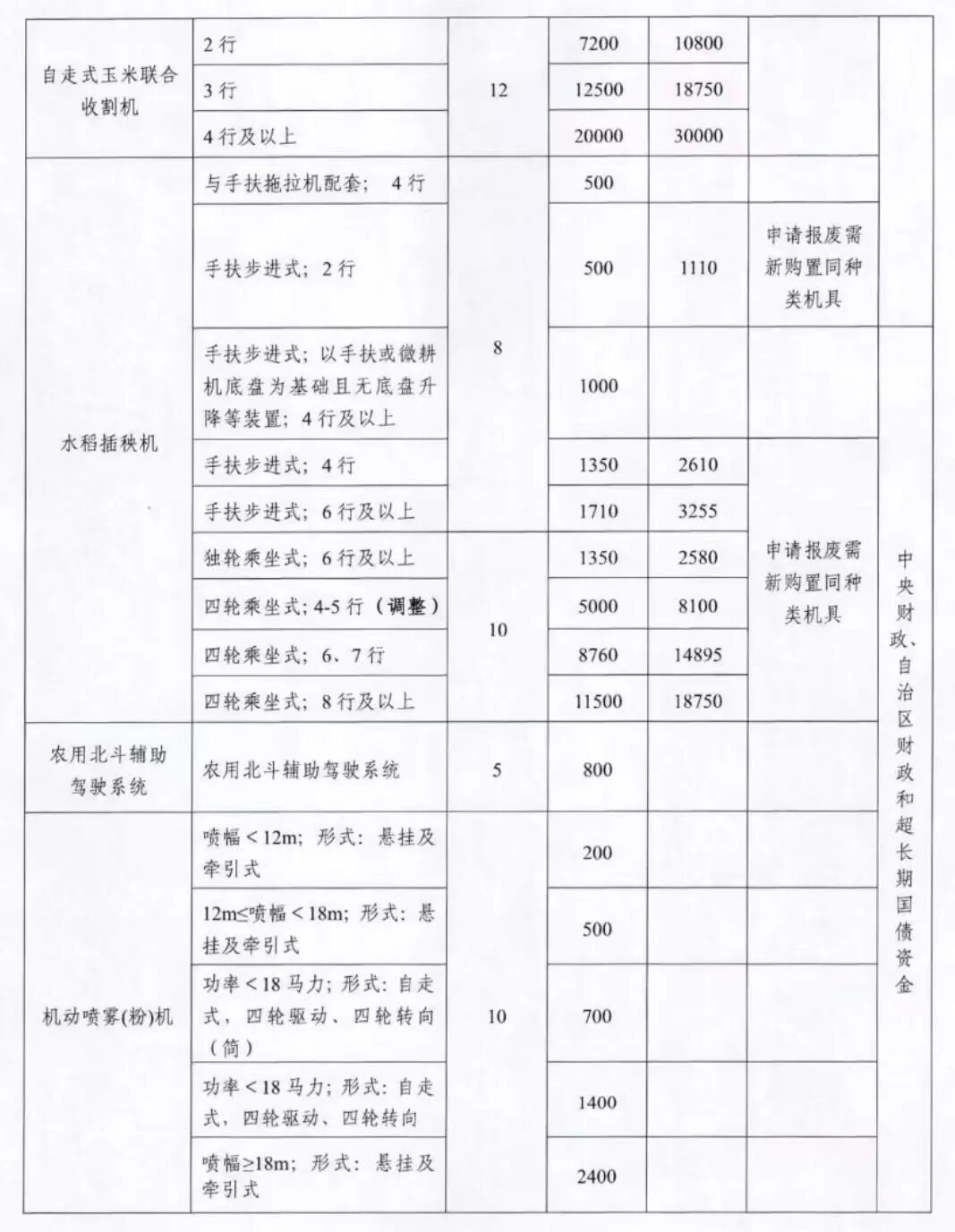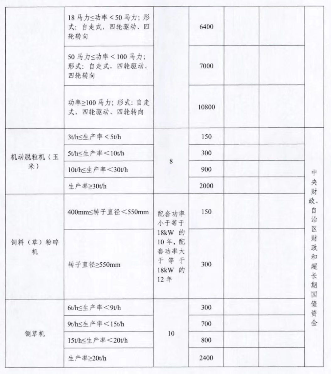 【政策标准】坚持“农牧民自愿、政策支持、方便高效、安全环保”的原则,淘汰耗能高、污染重、安全性能低的老旧农机。中央补贴机具包括拖拉机、播种机、联合收割机、水稻插秧机、农用北斗辅助驾驶系统、机动喷雾(粉)机、机动脱粒机(玉米)、饲料(草)粉碎机、铡草机等9种。