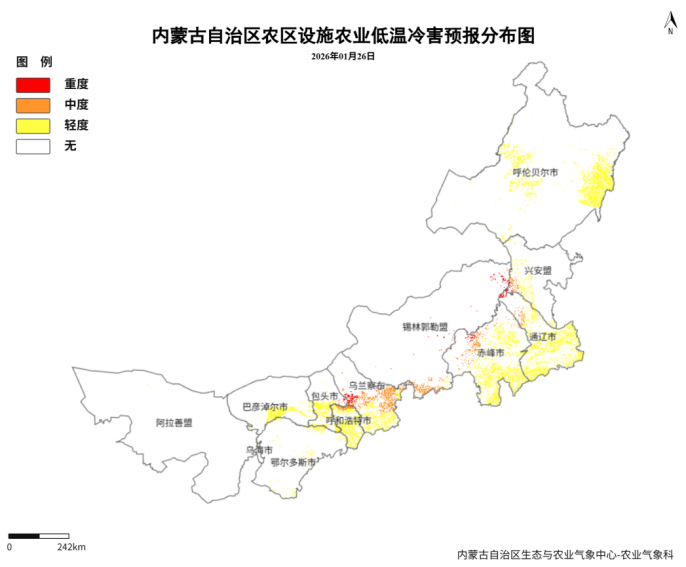 图1 1月24日至26日内蒙古地区设施农业低温冷害预报分布图