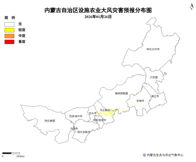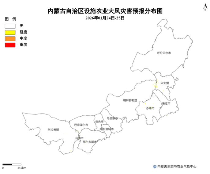 预计1月24日至25日,呼伦贝尔市中部和东部、内蒙古东部偏南、中部偏南以及西部偏东大部分地区有轻度或中度设施农业低温冷害,其中,兴安盟西南部、通辽市北部和东南部、赤峰市西北部、锡林郭勒盟东部和中部偏南的零星地区有重度设施农业低温冷害;26日,呼伦贝尔市中部和东部、内蒙古中东部偏南大部、西部偏东部分地区有轻度或中度设施农业低温冷害,其中,兴安盟西南部、通辽市北部、赤峰市西北部、锡林郭勒盟东部和中部偏南局部、乌兰察布市中部偏西和包头市东部部分地区有重度设施农业低温冷害(图1),可导致作物生长缓慢和受冷。1月24日至25日,兴安盟西部和南部、通辽市南部、赤峰市中北部、锡林郭勒盟东部、乌兰察布市东部和内蒙古西部偏东零星地区有轻或中度设施农业大风灾害;26日,赤峰市西部、锡林郭勒盟南部、乌兰察布市中东部、呼和浩特市北部和包头市东部部分地区有轻或中度设施农业大风灾害(图2),易造成棚架受损、棚膜撕裂等设施农业设备损坏。