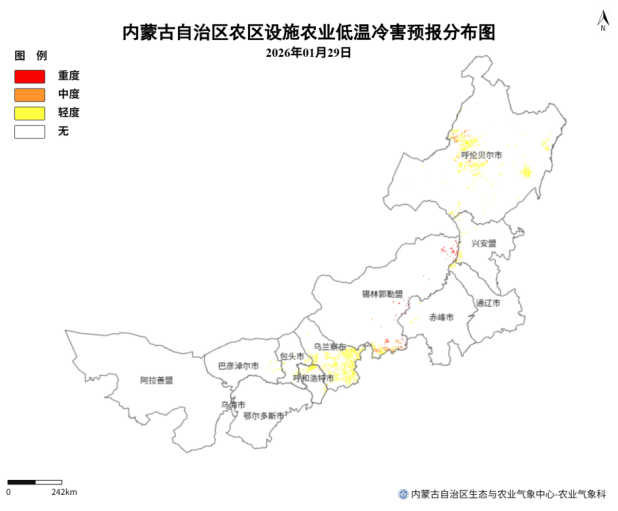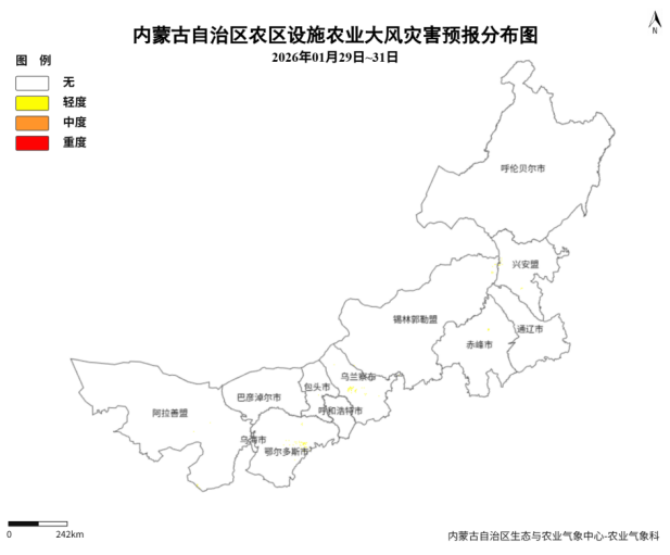 预计1月29日,呼伦贝尔市中部和东部、兴安盟西部、通辽市西北部、赤峰市西北部、内蒙古中部偏南以及西部偏东部分地区有轻度或中度设施农业低温冷害,兴安盟西南部、锡林郭勒盟东部和南部的零星地区有重度设施农业低温冷害;30日至31日,呼伦贝尔市中部和东部、兴安盟西北部、内蒙古中部偏南以及西部偏东大部分地区有轻度或中度设施农业低温冷害,兴安盟西南部、锡林郭勒盟东部和中部偏南、乌兰察布市南部、呼和浩特市西北部、包头市东部和中部偏西以及巴彦淖尔市东部的零星地区有重度设施农业低温冷害(图1),可导致作物生长缓慢和受冷。1月29日至31日,兴安盟西部和南部、赤峰市中部局部、锡林郭勒盟东部、乌兰察布市中部、包头市中部局部、鄂尔多斯市中部偏东和阿拉善盟南部零星地区有轻或中度设施农业大风灾害(图2),易造成棚架受损、棚膜撕裂等设施农业设备损坏。