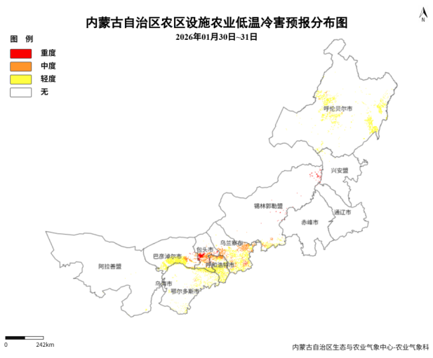 图1 1月29日至31日内蒙古地区设施农业低温冷害预报分布图