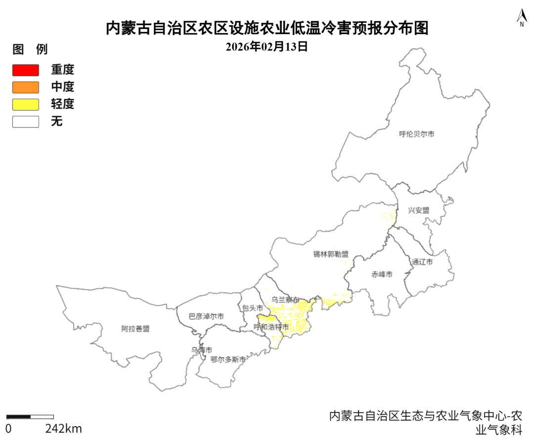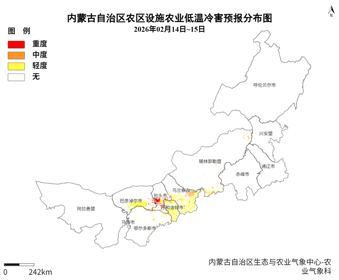 图1 2月13日至15日内蒙古地区设施农业低温冷害预报分布图