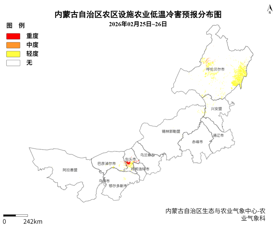 图1 2月25日至26日内蒙古地区设施农业低温冷害预报分布图