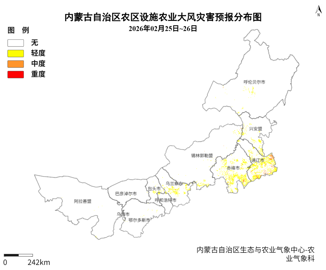 图2 2月25日至26日内蒙古地区设施农业大风灾害预报分布图