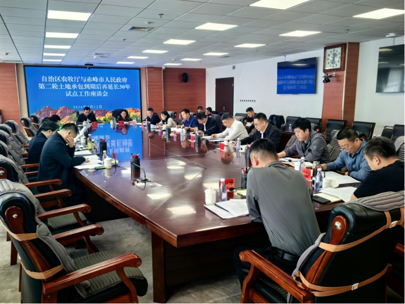 4月12日,自治区农牧厅在赤峰市召开第二轮土地承包到期后再延长30年试点工作座谈会。自治区农牧厅党组书记、厅长郭占江出席并讲话,赤峰市政府副市长、农牧部门负责人以及试点旗县、乡镇代表参加座谈。