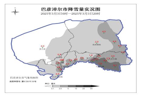 3 月 3 日 6 时至 20 时,我市大部地区出现小雪、偏南地区及乌拉特中旗东部中雪、乌拉特前旗南部大雪,最大降雪量出现在乌拉特前旗额尔登布拉格苏木 8.4 毫米。各旗(县、区)政府所在地降雪量(单位:毫米):临河区 3.0、磴口县 0.8、杭锦后旗 2.4、五原县 1.8、乌拉特前旗 7.0、乌拉特中旗 2.0、乌拉特后旗 0.8。4 日清晨气温较低,全市最低气温-8~-3℃。