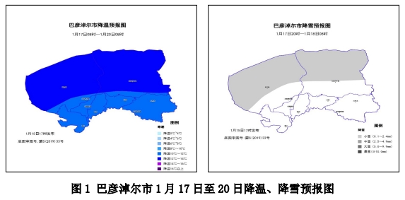 强寒潮:17 日至 20 日套区气温下降 10~12℃、北部下降14℃左右,19 日早晨北部气温降至最低,最低气温-27~-24℃;20 日早晨套区气温降至最低,最低气温-24~-20℃,21 日早晨气温维持偏低。
