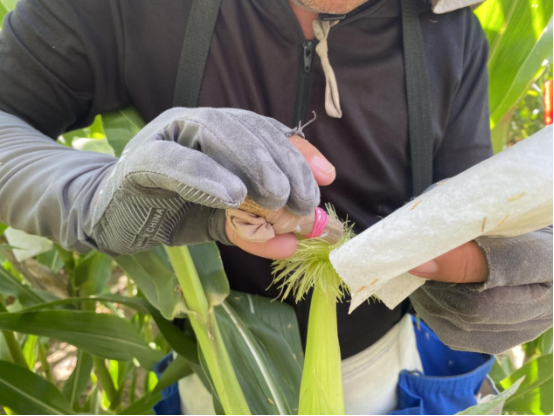 授粉完毕,将雌穗套袋整理好,注意不要套到底,穗顶部最好预留出雌穗生长所需的一定的空间,然后用大头针固定雌穗纸袋在雌穗上。在挂牌上写明授粉方式和授粉日期,挂在授粉株上。