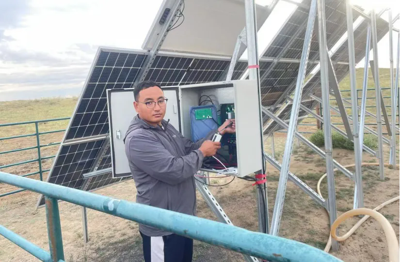 过了几个月,经过反复试验,他的第二个发明——远程控水系统研制完成。打开手机监控,点击出水按钮,不一会儿,几公里外的饮水池就蓄满了水。“后来,我们又增加了传感器系统,当牛羊靠近饮水池时,系统可以自动识别并控制出水量。”德乐黑洪格尔介绍。