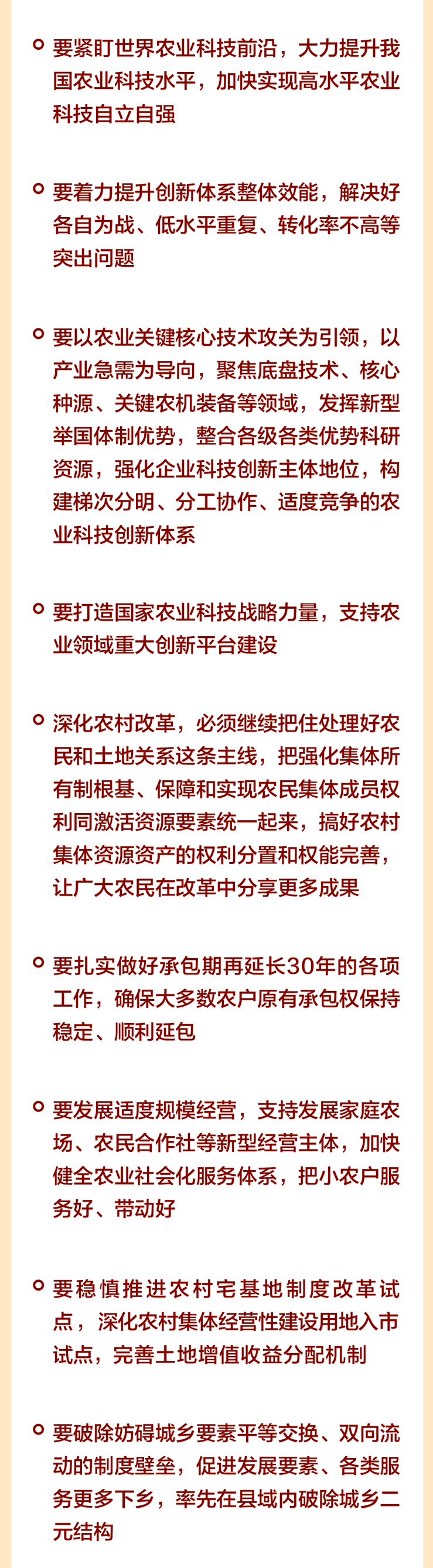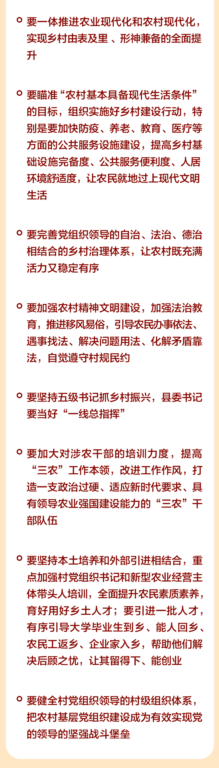 - 各级党委和政府要坚持把解决好“三农”问题作为重中之重,坚持五级书记抓乡村振兴,奋发进取、真抓实干,努力把农业建成现代化大产业、使农村基本具备现代生活条件、让农民生活更加富裕美好。